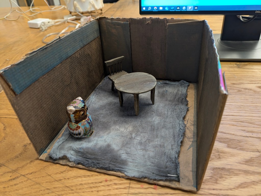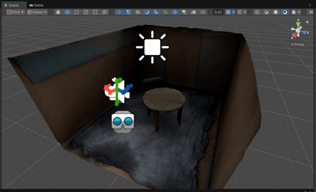 I was able to get my first working prototype finished! It has almost all of the hardware problems worked out. I’ll post some more details about both the physical and the digital side of it in other posts. I have a Quest 3 VR application that starts on pass through mode so you can see the actual space around you with the built environment with an avatar in it. You can then press any button on the keyboard associated with the headset which switches it into VR mode where you are standing in the same spot on the physical set that the avatar is standing.