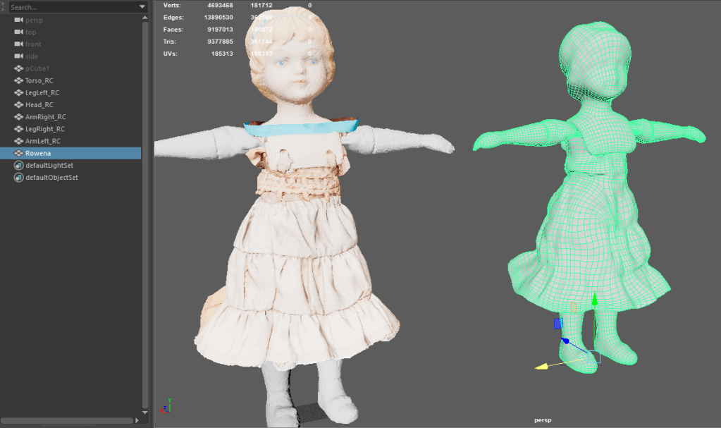 The puppet captured well so the cleanup was very routine. The method that I prefer to use is to do minimal cleanup in Reality Capture itself. The tool is a little difficult to use for that purpose. I trim out as much as I can, but I do a lot of the larger cleanup in Zbrush.