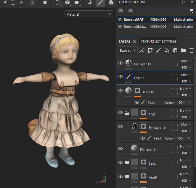 I use Substance Painter for my material creation. This is where the vertex color on the high poly comes back. When you do a high to low poly bake in Substance Painter, you can use the ID map bake set to vertex color to bake out the base color map from the high poly to use on the low poly. For this particular puppet I have two different materials – one for her skirt and one for the rest. The reason is because I’ll need to make the skirt a two sided material in Unity when she eventually gets put in the engine.